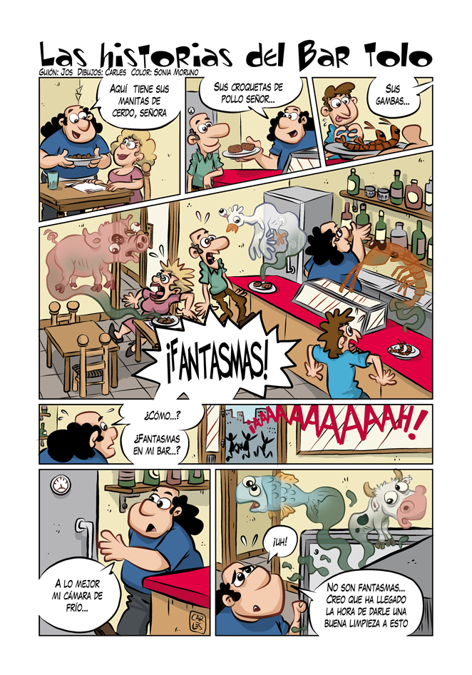 Terroríficas apariciones en el Bar Tolo… ¿serán espíritus condenados? ¿ectoplasmas?… Podréis saberlo en Las Historias del Bar Tolo del Especial Fantasmas de la revista Amaníaco. Con el insuperable guión de Jos y los fantásticos colores de Sonia Moruno.