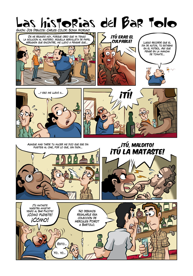 Tolo, dueño del Bar Tolo, es perspicaz y atento a los detalles con los que hilvana un razonamiento lógico e inapelable que le lleva al… ¿criminal? Hete aquí una muestra con guión de Jos y colores de Sonia Moruno que podéis disfrutar en papel en la revista Amaníaco ESPECIAL DETECTIVES.