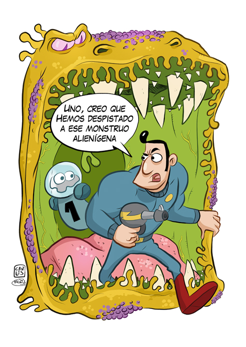 Aquí está el último dibujo que he hecho en el 2017, Cosmo Jim y Uno «saliendo» de problemas, como siempre con el fantástico color de Sonia Moruno.