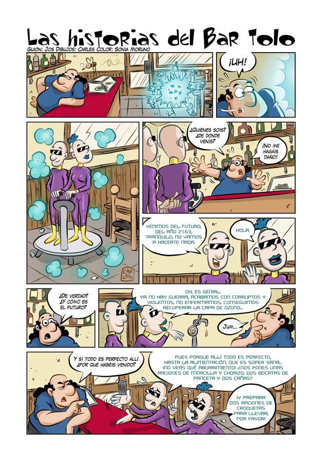 En el Bar Tolo suceden las cosas mas increíbles… ¡hasta tiene clientes de tiempos futuros!. Podéis verlo en la última aventura que dibujé, escrita por Jos y coloreada por Sonia Moruno.