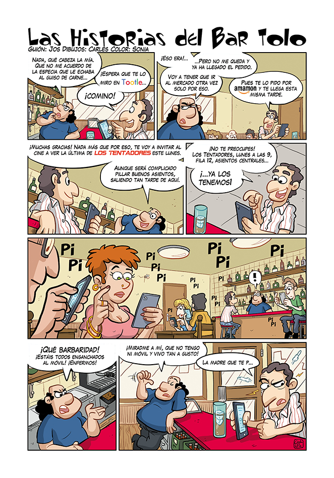 Toda nuestra vida ya pasa por el móvil… Tolo lo explica perfectamente y se resiste a caer en esa secta… o no… Otra buena historia del Bar Tolo escrita por Jos, dibujada por mi y coloreada por Sonia Moruno.