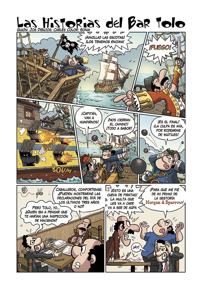Las aventuras de piratas son de las temáticas que siempre me han gustado y por ello disfruté como un enano dibujando esta página de «Las Historias del Bar Tolo» para el Especial Piratas de la revista Amaníaco. Una vez más escrita por el gran Jos y maravillosamente coloreada por Sonia. ¡Argh! ¡A los cañones filibusteros!