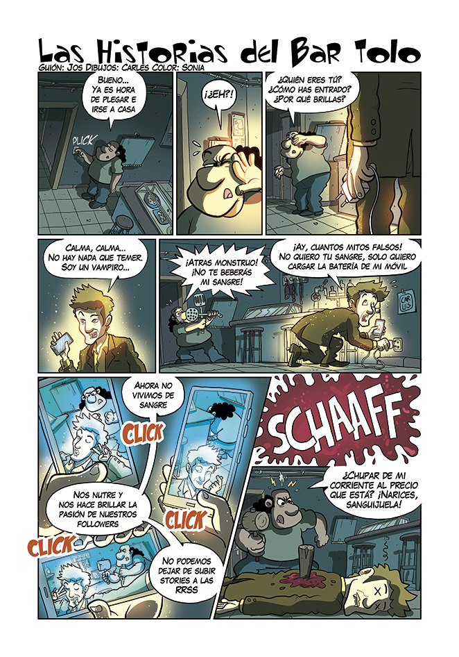 A lo largo de los siglos la iconografía de los vampiros a evolucionado. En el Especial Vampiros de la revista Amaníaco mostramos uno de los mas actuales aspectos del eterno vampiro. Sigue siendo terrible… Como siempre con guion de Jos y color de Sonia Moruno.