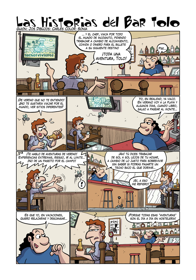 Cada uno entiende la «Aventura» a su manera… en Las Historias del Bar Tolo lo explicamos de la mano de Jos al guion, mis dibujillos y el color de Sonia Moruno.