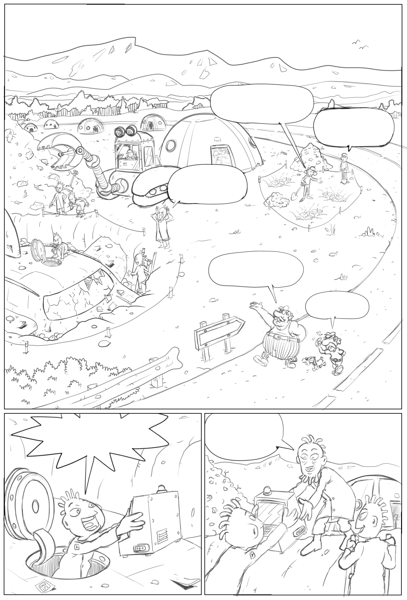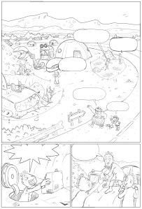 Lentamente voy avanzando en mi proyecto de cómic «Las Aventuras de Cosmo Jim». He aquí los lápices de la primera página… poco a poco lo conseguiré.